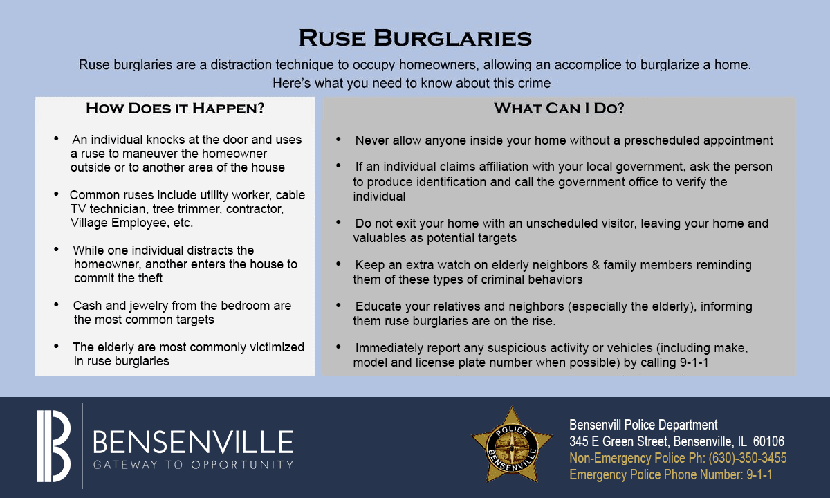 There has been an increase in ruse type burglaries around our area. Residents can safeguard themselves from this dangerous crime by remaining vigilant and educating themselves on what to look for when approached at their place of residence. A ruse burglary is committed when two or more individuals work as a team to distract a homeowner (often posing as a utility worker or solicitor) while the other(s) enter the home and steal items of value.